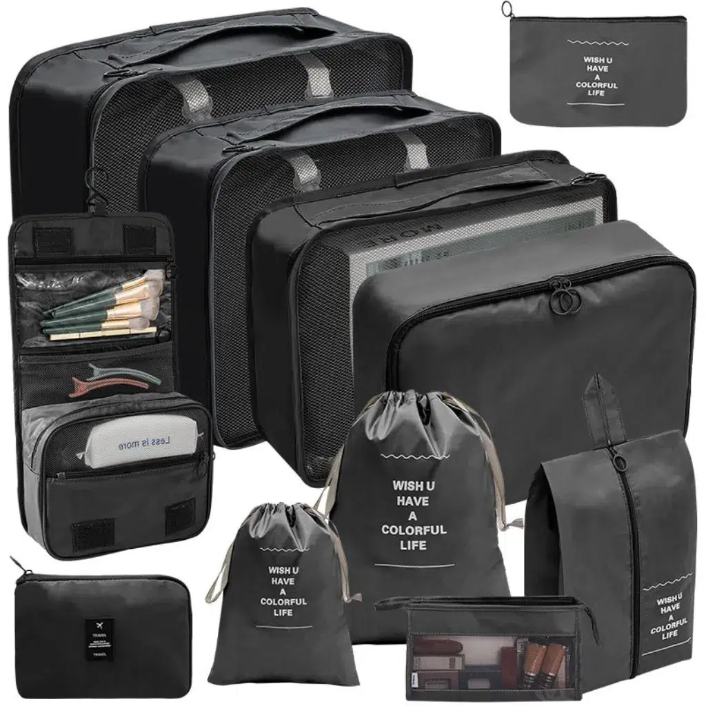 ست کامل ۱۱ تکه: شامل کیف لباس، کفش، لباس زیر، لوازم آرایش، شارژر، و لوازم جانبی سفر.