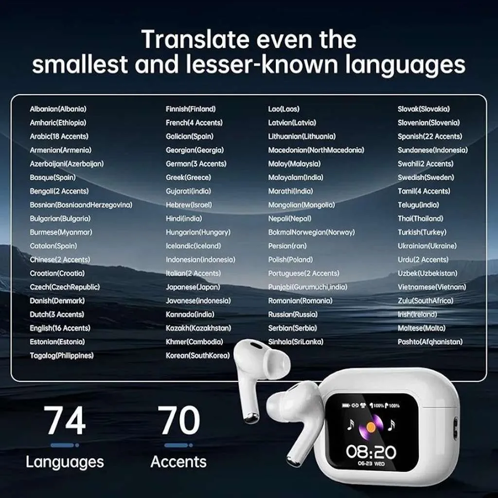 بهترین ایرپاد هوشمند مانیتور دار با نمایشگر لمسی، ترجمه همزمان ۷۴ زبان و حذف نویز فعال (ANC). WT-9، همراه هوشمند شما برای سفرهای بین‌المللی و غوطه‌وری در موسیقی با کیفیت صدای بی‌رقیب